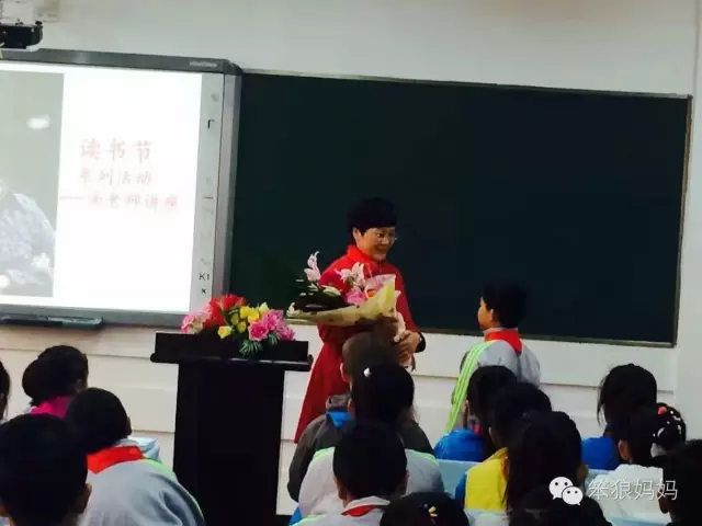笨狼妈妈汤素兰老师在辽宁省抚顺市南阳小学讲座,受到了同学们的热烈欢迎,可爱的小学生们献上了鲜花。