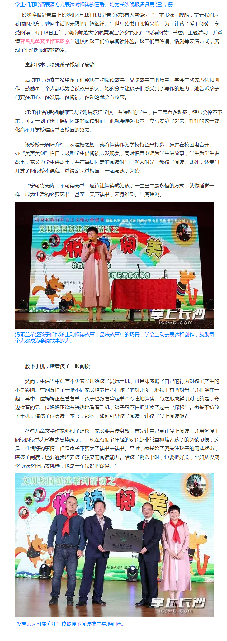 4月23日是世界读书日,笨狼妈妈汤素兰老师是作家,也是热心的阅读推广人,经常到学校进行阅读讲座,参加各种阅读推广活动。我们就去看看笨狼妈妈在参加湖南师范大学附属滨江学校的“悦读阅美”书香月主题活动时说了些什么吧!