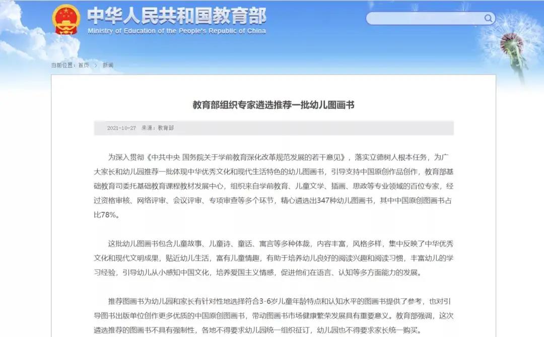 为深入贯彻《中共中央国务院关于学前教育深化改革规范发展的若干意见》,落实立德树人根本任务,为广大家长和幼儿园推荐一批体现中华优秀文化和现代生活特色的幼儿图画书,引导支持中国原创作品创作,教育部基础教育司委托基础教育课程教材发展中心,组织来自学前教育、儿童文学、插画、思政等专业领域的百位专家,经过资格审核、网络评审、会议评审、专项审查等多个环节,精心遴选出347种幼儿图画书,其中中国原创图画书占比78%。